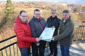 Zum alljährlichen Wasserturm-Fest im Juni werden dringend Sanitäranlagen für die zahlreichen Besucher benötigt. Und so wandten sich „Die Neundorfer“ an Sternquell. Produktmanager Thomas Münzer und Gebietsverkaufsleiter Erik Walk übergaben den Scheck in Höhe von 750 Euro feierlich an die Vereinsmitglieder – standesgemäß auf der elf Meter hohen Aussichtsplattform.