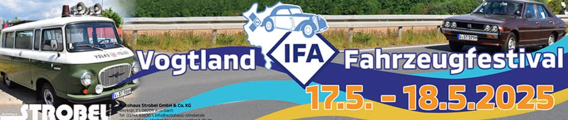 25 Jahre Vogtland IFA Fahrzeugfestival! Kommen Sie am 17. Mai - 18. Mai 2025 zum IFA Treffen nach Auerbach/Rebesgrün ins Gewerbegebiet West! Es erwartet Sie